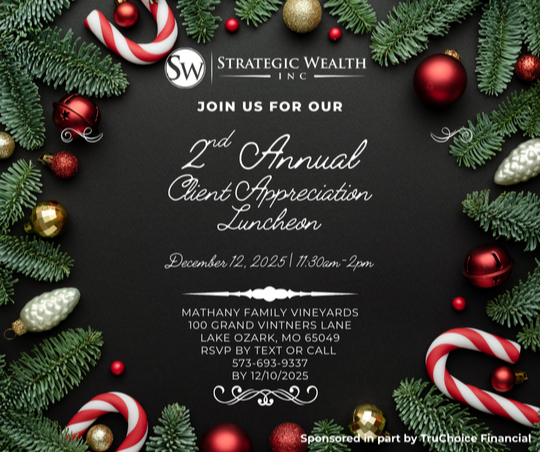 Join Strategic Wealth for a relaxed and festive Client Appreciation Luncheon at our local Mathany Family Vineyards. Drop in anytime between 11:30 a.m. and 2:00 p.m. on December 12, 2025, to enjoy wine, great food, and warm conversation as we celebrate and thank you for your continued trust and partnership. Please RSVP by December 10, 2025, we look forward to seeing you!